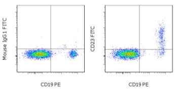 Description: The EBVCS2 monoclonal antibody reacts with human CD23, a 45 kDa type II transmembrane glycoprotein. CD23 is expressed on mature B cells, mantle zone B cells, follicular dendritic cells and at low levels on T, NK, langerhans cells and platelets. Expression of CD23 is upregulated upon B cell activation, and soluble forms of the antigen have been reported to be biologically active. CD23 is a low affinity receptor for IgE and is thought to play a role in the regulation of IgE response and B cell activation. CD21 and the alpha subunit of CD11b and CD11c bind to CD23.