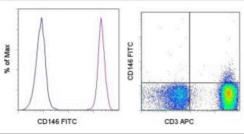 Description: The monoclonal antibody P1H12 recognizes CD146 also known as MUC18, s-endo, Endo-CAM and Mel-CAM, which is a member of the Ig superfamily of proteins. The expression of CD146 is found on endothelial cells, bone marrow fibroblasts and some tumors (especially melanoma). Recently mesenchymal stromal cells and endometrial stromal cells have also been shown to express CD146. The presence of CD146 on circulating blood cells have been confined to a subset of T cells rather than circulating endothelial cells, as expression of other endothelial markers (CD31 and CD51/61) is negative. Expression can be found on activated lymphocytes. The protein is heavily glycosylated with more than 50% of the mass from carbohydrates.