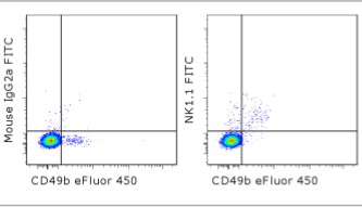 Description: The PK136 monoclonal antibody reacts with mouse NK1.1, an antigen expressed by natural killer cells and a subset of T cells in the NK1.1 mouse strains including C57BL and NZB. Several commonly used laboratory mouse strains such as BALB/c, SJL, AKR, CBA, C3H and A do not express the NK1.1 antigen. For detection of NK cells in these strains the monoclonal antibody DX5 14-5971 should be used. Simultaneous staining of C57BL/6 spleen cells with PK136 and DX5 reveals coexpression of both markers by a majority of cells as well as presence of small populations of DX5+PK136- and DX5-PK136+ cells.