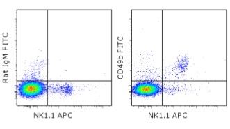 Description: The DX5 monoclonal antibody reacts with CD49b, an antigen expressed on a majority of mouse natural killer cells and a subset of T cells. DX5 reacts with all strains of mouse tested including the most commonly used strains, BALB/c, C57BL/6, C3H, CBA, DBA, AKR, SJL and 129. Simultaneous staining of C57BL/6 spleen cells with anti-NK1.1 mAb (PK136) and DX5 reveals coexpression of both markers by a majority of cells as well as presence of small populations of DX5+PK136- and DX5-PK136+ cells.