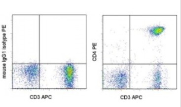 Description: The SK3 monoclonal antibody reacts with human CD4, a 59-kDa cell surface receptor expressed by a majority of thymocytes, a subpopulation of mature T helper cells, and, in low levels, monocytes. CD4 is a receptor for the human immunodeficiency virus (HIV). SK3 blocks HIV binding and mixed lymphocyte reaction. The SK3 and RPA-T4 monoclonal antibodies do not cross-block binding, suggesting recognition of distinct epitopes.