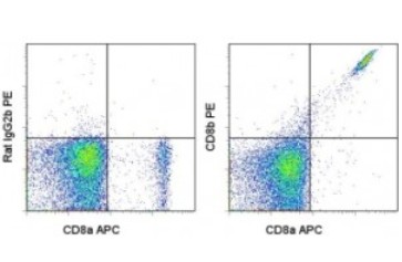 Description: The eBioH35-17.2 monoclonal antibody reacts with the mouse CD8 beta molecule. The CD8 beta chain associates with the CD8 alpha chain to form the CD8 alpha/beta heterodimer expressed on the surface of a majority of thymocytes, and on peripheral cytotoxic alpha beta TCR T cells. CD8 binds to MHC class I and plays a role in T cell development and activation of mature T cells.