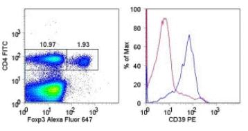 Description: The 24DMS1 monoclonal antibody reacts with mouse CD39, also known as NTPDaseI. E-NTPDases are enzymes that convert nucleoside tri- and diphosphates (NTDPs) into nucleoside monophosphate (NMP), thereby removing toxic extracellular ATP and ADP. CD39 is the dominant member of this family in the immune system and is involved in suppression of inflammation and control of platelet activation. CD39 can impact expression of CD73, another E-NTPase. Together, these molecules influence inflammation responses. CD39 is expressed on B cells, Langerhans cells and most monocytes. In addition, CD39 is found on a subset of CD4+ T cells that are mostly CD25+FoxP3+ T reg cells. T reg cells from CD39-null mice showed impaired suppressive properties in vitro and in vivo.
