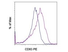 Description: The Michel-17 monoclonal antibody reacts with mouse CD83, a 45kDa cell surface glycoprotein and a member of the Ig superfamily. The mouse CD83 antigen is expressed predominantly on mature DC and activated lymphocytes. Cross-linking of CD83 with Michel-17 on DC or activated T cells does not induce any activation signal. CD83 plays an important role in T cell development through interaction with its ligand. CD83-Ig protein has revealed the presence of a CD83 ligand expressed mainly by B220+ cells in mouse spleen.