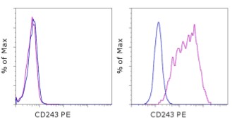 Description: This monoclonal antibody reacts with human Multidrug Resistant (MDR)-1, which is also known as P-glycoprotein (Pgp) and CD243. A 170-kDa transmembrane protein, MDR-1 is an ATP-dependent efflux pump for lipophilic compounds, including anti-cancer drugs. Expression of MDR-1 has been shown to correlate with multidrug resistance. In fact, tumor resistance to chemotherapy has been linked to MDR-1 expression in many cancers. MDR-1 is expressed in a variety of tissues, including the brain, kidney, liver, pancreas, and testes. Within the immune system, this molecule can be found on normal T, B, and natural killer cells, but not on monocytes.