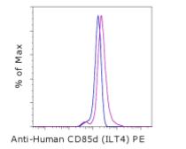 Description: The monoclonal antibody 42D1 recognizes the CD85d protein also known as ILT4, LIR-2. It is a member of the ILT (immunoglobulin-like transcript)/ LIR (leukocyte Ig-like receptor), MIR (monocytes Ig-like receptor) family. CD85d is a 110 kDa single transmembrane receptor with 3 Ig-like domains and a long cytoplasmic domain containing ITIMs (immunoreceptor tyrosine-based inhibitory motifs). Expression is confined to monocytes, macrophages and dendritic cells. The ligand for CD85d is non-classical class I HLA-G, -B and G1. Upon ligand binding, tyrosine phosphatase SHP-1 interacts with the ITIM. Interaction of HLA-G with ILT4/CD85d is thought to contribute to tolerance during fetal implantation. Additionally, it is the levels of ILT3 and ILT4 on DCs that suggests a role in organ allograft rejection.