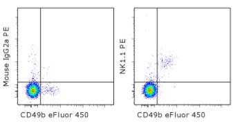 Description: The PK136 monoclonal antibody reacts with mouse NK1.1, an antigen expressed by natural killer cells and a subset of T cells in the NK1.1 mouse strains including C57BL and NZB. Several commonly used laboratory mouse strains such as BALB/c, SJL, AKR, CBA, C3H and A do not express the NK1.1 antigen. For detection of NK cells in these strains the monoclonal antibody DX5 (Cat. No. 14-5971) should be used. Simultaneous staining of C57BL/6 spleen cells with PK136 and DX5 reveals coexpression of both markers by a majority of cells as well as presence of small populations of DX5+PK136- and DX5-PK136+ cells.
