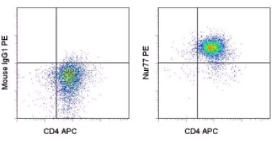 Description: This 12.14 monoclonal antibody reacts with mouse Nur77 (also known as NR4A1, TR3, NGFI-B, or NAK1), an inducible orphan nuclear receptor. Expressed in thymocytes and T cell lines, Nur77 promotes apoptosis and plays a role in thymocyte negative selection. Additionally, Nur77 has been shown to be critical for steroid biosynthesis in Leydig cells as well as for the effects of dopamine. In addition, Nur77 has been shown to interact with FoxP3 in regulatory T cells. However, our results with this antibody do not correlate with this observation.