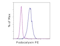 Description: The monoclonal antibody B34D1.3 recognizes human podocalyxin, a protein expressed on undifferentiated human embryonic stem cells (ES), embryonic carcinoma cells (EC), and embryonic germ cells (EG). Podocalxyin is a heavily glycosylated cell adhesion protein with homology to CD34 and endoglycan. It was first identified on kidney podocytes, and then found to be upregulated in a variety of human cancers such as breast and prostate cancer. Like other stem cell-specific markers, the epitope recognized by the B34D1.3 antibody is lost upon cell differentiation.