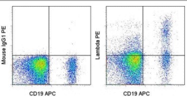Description: The monoclonal antibody 1-155-2 recognizes the lambda light chain of human immunoglobulin. Approximately 22-kDa, the Ig lambda chain is comprised of one variable and one constant region. Two lambda chains together with the heavy chain comprise the whole Ig structure. Expression of Ig lambda is typically found in less than half of B lymphocytes, and has been associated with neoplastic lymphomas.