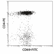 Clone FN50 recognizes the human CD69 antigen, also known as activation inducer molecule (AIM). CD69 is involved in the early events of lymphocyte, monocyte, and platelet activation. Cross-linking of CD69 induces cytotoxic activity and costimulates cytokine production of activated NK cells and selected T cell clones. CD69 is transiently expressed on activated leukocytes including T cells, thymocytes, B cells, NK cells, neutrophils, and eosinophils. It is constitutively expressed by a subset of medullary mature thymocytes, platelets, mantle B cells, and certain CD4+ T cells in germinal centers of normal lymph nodes.