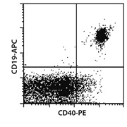 The HB14 monoclonal antibody reacts with human CD40, a 45–50 kDa type I transmembrane glycoprotein and member of the tumor necrosis factor receptor (TNFR) superfamily. It is expressed primarily on B cells, macrophages, dendritic cells, endothelial cells, and fibroblasts and at lower levels on plasma cells and a subset of peripheral T cells. CD40 is involved in B cell differentiation and proliferation, isotype class-switching, and protection of B cells from apoptosis. Interaction of CD40 with its ligand CD154 is important in T cell–B cell interaction and plays a role in costimulation and immune regulation.