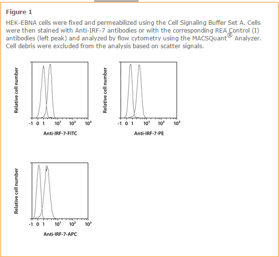 Clone REA521 recognizes the human interferon regulatory factor 7 (IRF-7) antigen, regardless of phosphorylation status. IRF-7 is a member of the IRF family of transcription factors and a key player in the innate immune response against viral infections. Constitutive expression of IRF-7 is limited to peripheral blood lymphocytes and dendritic cells while in most cell types its expression can be induced by type I interferon. IRF-7 is sequestered in the cytoplasm of uninfected cells and following viral infection, double-stranded RNA, or toll-like receptor signaling, it becomes phosphorylated by TBK and IKK-i kinases. Phosphorylated IRF-7 migrates in the nucleus where it can activate interferon type I genes and other interferon-stimulated genes.