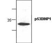 This antibody was generated using a peptide at the amino terminus of human p53DINP1 and can recognize the alpha isoform at about 27 kDa and in some lysates also the beta form at about 18 kDa.