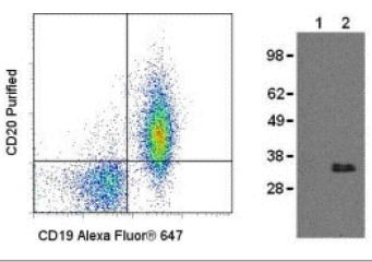 Description: The AISB12 monoclonal antibody reacts with mouse CD20. CD20 is a B cell-specific 32kDa membrane protein involved in intracellular calcium regulation. CD20 expression begins after the induction of CD19 during development, and is coexpressed with IgM during the pre-B to immature B cell transition in bone marrow. Expression then increases during maturation with almost all mature cells expressing some level of CD20. The human CD20 antigen has proven to be an effective immunotherapeutic target in B cell lymphoma and several autoimmune diseases including rheumatoid arthritis and type I diabetes. CD20 consists of 4 transmembrane domains and a 44 amino acid extracellular loop domain where AISB12 binds.