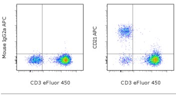 Description: The HB5 monoclonal antibody reacts with human CD21, an approximately 145 kDa type I transmembrane protein. CD21 is expressed by mature B cells, folliculate dendritic cells and a subset of epithelial cells and is a receptor for complement component C3d and Epstein-Barr virus (EBV). CD21, in association with CD19 and CD81, participates in the multimolecular complex with BCR and is involved in B cell activation.