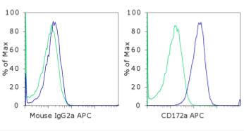 Description: This 15-414 monoclonal antibody reacts with human CD172a, also known as signal regulatory protein alpha (SIRP alpha). This cell surface glycoprotein consists of three Ig-like extracellular domains and two cytoplasmic immunoreceptor tyrosine-based inhibitory motifs (ITIMs). The ITIM domains have been demonstrated to recruit and bind the Src homology 2 domain-containing phosphatases SHP-1 and SHP-2. CD172a is expressed on monocytes, granulocytes, dendritic cells, and CD34+CD38- hematopoietic progenitor cells but not on T and B lymphocytes. Moreover, neurons have also been shown to express CD172. The integrin-associated protein CD47 is the extracellular ligand for CD172a. Studies show that CD172a is involved in dendritic cell-mediated T cell activation, neutrophil migration, and phagocytosis.