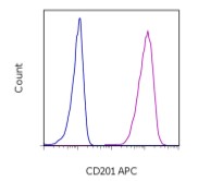 Description: The monoclonal antibody RCR-227 reacts with human CD201, which is also known as the endothelial protein C receptor (EPCR), a 46-kDa transmembrane protein related to class I MHC. CD201 was originally identified on vascular endothelium cells, predominantly larger blood vessels. It is also expressed on monocytes, lymphocytes, hematopoietic stem cells, neutrophils, and eosinophils. CD201 serves as a binding site for protein C, activated protein C (APC), and factor VII/VIIa. A soluble form has also been identified in the plasma. CD201 plays a role in controlling coagulation as disruption of its gene in mice caused placental thrombosis and early embryonic death. This cell surface molecule is also involved in the anti-inflammatory response. APC binding to CD201 enables PAR-1 activation that confers cytoprotective effects. In monocytes, APC binding decreases secretion of proinflammatory cytokines, chemokines, and growth factors. Finally, CD201 has been shown to inhibit lymphocyte migration.