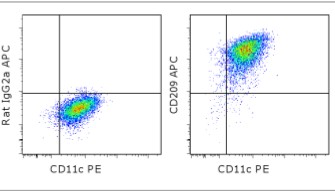 Description: The eB-h209 monoclonal antibody reacts with human CD209, also known as DC-SIGN, a 44 kDa type II transmembrane protein. DC-SIGN contains a C-type lectin binding domain and binds ICAM-3, ICAM-2, and HIV virus. Human dendritic cells preferentially express DC-SIGN. It has been postulated that DC-SIGN serves as a receptor for capture, trafficking, and transmission of HIV to T cells and supports primary immune response. eB-h209 was developed against a C-terminal peptide of human DC-SIGN.