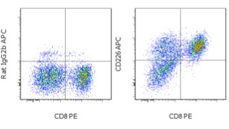 Description: This 10E5 monoclonal antibody reacts with mouse CD226, which is also known as DNAX accessory molecule-1 (DNAM-1). CD226 is an adhesion molecule expressed primarily on T cells, including thymocytes. The highest levels of CD226 are found on naïve CD8 T cells. Moreover, expression of CD226 is regulated differentially in CD4 T cells. Under certain culture conditions, CD226 can be upregulated in Th1 and downregulated in Th2 and Th0 cells. This cell surface receptor can also be detected on natural killer cells, some B cell subsets, monocytes, and platelets. Interaction with its ligands, the poliovirus receptor (CD155) and CD112, results in adhesion and cell signaling events that promote innate and adaptive immunity, including differentiation, survival, and cytotoxicity.