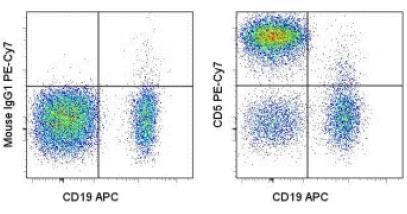 Description: The UCHT2 monoclonal antibody reacts with human CD5, a 67 kDa protein expressed by a majority of thymocytes and mature T cells and a subset of B cells. Signaling through the CD5 molecule activates T cells and binding of CD5 to its ligand on B cells, CD72, and plays an important role in T-B interaction and proliferation.\\\\The monoclonal antibody UCHT2 recognizes primate CD5.