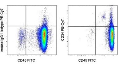 Description: The 4H11 monoclonal antibody reacts with human CD34, also known as mucosialin. CD34 belongs to a protein family which also includes endoglycan and podocalyxin. Members of this family are single pass transmembrane proteins with a heavily glycosylated extracellular and N-terminal mucin domain. CD34 was first identified as an antigen expressed on hematopoietic progenitors, and has since been extensively used as a marker to isolate cells capable of hematopoietic cell engraftment. In spite of this, the function of CD34 remains unresolved. In addition to expression on hematopoietic progenitors, CD34 is expressed on some populations of mesenchymal stem cells, tumor cell lines, and by vascular endothelia in the adult. Epitopes of CD34 have been assigned to three classes (class I, II or III) based on their differential sensitivity to enzymatic cleavage by neuraminidase, chymopapain, or O-glycoprotease. According to this analysis, the 4H11 antibody belongs to class III, indicating that it reacts with a protein epitope.