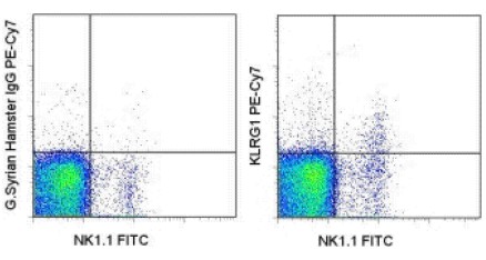 Description: This 2F1 monoclonal antibody reacts with the mouse Killer cell Lectin-like Receptor G1 (KLRG1), also known as Mast cell Function-associated Antigen (MAFA). KLRG1 is a homodimer of glycosylated 30-38 kDa subunits and contains a cytoplasmic motif similar to the immunoreceptor tyrosine-based inhibitory motif (ITIM). Rat MAFA was identified as an antigen specific to rat mast cells; however, the expression of mouse KLRG1/MAFA using 2F1 has not been detected on the surface of mouse mast cell lines, bone marrow-derived mast cells, or peritoneal mast cells. This antigen is expressed on approximately one-third of mouse NK cells and a subset of T cells. MHC class I molecules regulate KLRG1 via interactions with class I-specific inhibitory Ly49 molecules and SHP-1 signaling. Although KLRG1 and Ly49 are both lectin-like inhibitory receptors that are regulated by class I MHC expression, the effects of this on cell surface expression of these molecules are opposing, and the underlying regulatory mechanisms distinct.