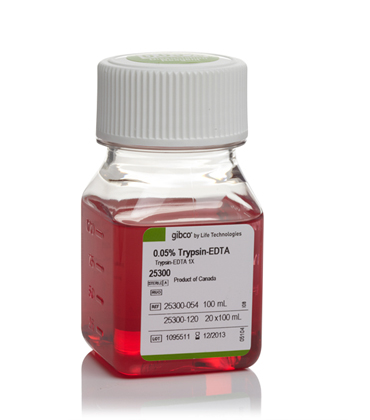 Gibco® Trypsin-EDTA is made from trypsin powder, an irradiated mixture of proteases derived from porcine pancreas. Due to its digestive strength, trypsin is widely used for cell dissociation, routine cell culture passaging, and primary tissue dissociation. The trypsin concentration required for dissociation varies with cell type and experimental requirements. See the complete range of Gibco® trypsin solutions and recommended dissociation conditions.