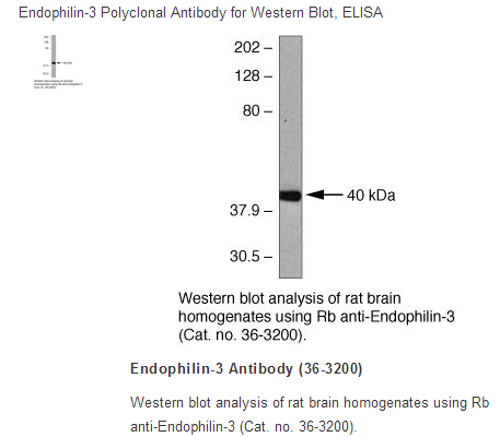 DetailsTested species reactivityMouse , RatHost / IsotypeRabbit / IgGClassPolyclonalTypeAntibodyImmunogenSynthetic peptide derived from the internal region of the mouse endophilin 3 (SH3p13) proteinConjugateUnconjugatedFormLiquidConcentration0.25 mg/mlPurificationAntigen affinity chromatographyStorage bufferPBS, pH 7.4Preservative0.1% sodium azideStorage Conditions-20°C