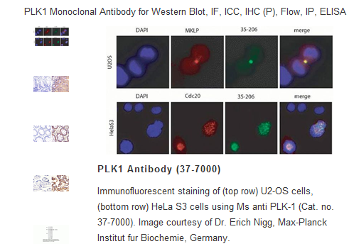 Considerable evidence indicates that a Polo-Like Kinase (PLK) plays an important role in cell cycle regulation. PLK is also required for bipolar spindle formation, activation of the anaphase-promoting complex/cyclosome, and cytokinesis. Recent work led to the identification of a PLKK that is thought to be responsible for activation of PLK. Recent work (Erikson, et al., 2004) has shown that PLKK is in turn activated by phosphorylation at three sites (Ser482, Ser486 and Ser490). Thus activation of PLK is thought to involve a kinase cascade involving the phosphorylation of Ser482,486,490 in PLKK.