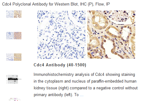 Fbw7/Cdc4 is a member of the F box protein family which are characterized by an approximately 40 amino acid motif, the F box. The F box proteins constitute one of the four subunits of ubiquitin protein ligase complex called SCFs (SKP1-cullin-F box), which function in phosphorylation-dependent ubiquitination. The F box proteins are divided into 3 classes: Fbws containing WD40 domains, Fbls containing leucine rich repeats, and Fbxs containing either different protein-protein interaction modules or no recognizable motifs. Fbw7 belongs to the Fbws class; in addition to an F box, this protein contains 7 tandem WD40 repeats. It binds directly to cyclin E and probably targets cyclin E for ubiquitin mediated degradation. Mutations of this gene are detected in ovarian and breast cancer cell lines. Alternative splicing of this gene generates 2 transcript variants diverging at the 5' termini.