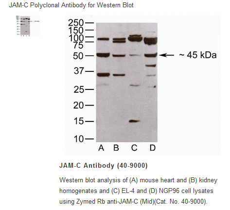 Synthetic peptide derived from an internal region of the mouse and rat JAM-C proteins, which differs from human, bovine, and dog by one conservative amino acid replacement