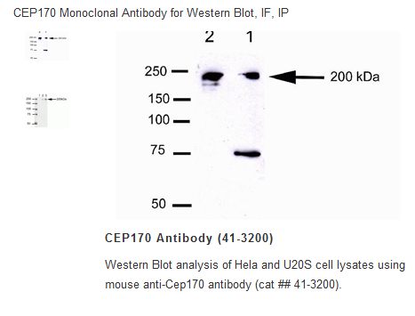 Ms anti-Cep170; Unconjugated Monoclonal antibody specific to Human (Cp, Mk) Cep170. This antibody is validated for use in Western Blot, Immunoassay (ELISA), Immunocytochemistry/ Immunofluorescence. Anti-Cep170 recognizes the expressed product of the CEP170 gene.