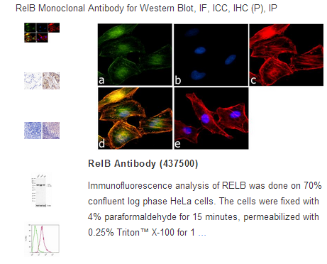 NF-kB (Nuclear Factor kappa B) is a nuclear transcription factor found in all cell types and is involved in cellular responses to stimuli such as stress, cytokines, free radicals, ultraviolet irradiation, and bacterial or viral antigens. NF-kB plays a key role in regulating the immune response to infection. Consistent with this role, incorrect regulation of NF-kB has been linked to cancer, inflammatory and autoimmune diseases, septic shock, viral infection and improper immune development. There are five members in the NF-kB family: NF-kB1, NF-kB2, RelA (also named p65), RelB, and c-Rel. The RelB protein is present in the cytosol, bound to p50 or p52 and an inhibitory IkB protein, forming an inactive trimeric complex. Following cell signalling events leading to IkB degradation, Rel/NFk-B proteins are translocated to the nucleus where they regulate gene expression. The genes controlled by Rel/NF-kB family members are predominantly genes involved in the host response to infection, stress and injury. RelB mediates the regulation of genes involved in immune and inflammatory processes.
