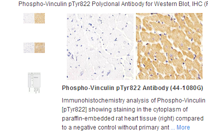 The antiserum was produced against a chemically synthesized phosphopeptide derived from a region of human vinculin that contains tyrosine 822. The sequence is conserved in mouse, rat, and chicken.