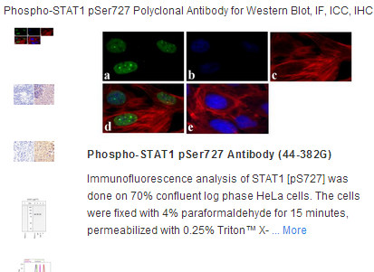 The antiserum was produced against a chemically synthesized phosphopeptide derived from the region of human STAT1 that contains serine 727. The sequence is conserved in mouse.