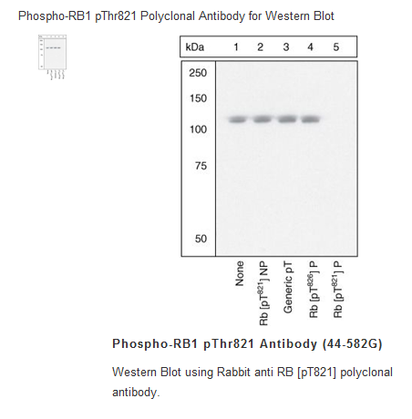 The antiserum was produced against a chemically synthesized phosphopeptide derived from a region of human Rb that contains threonine 821 (based on Swiss Protein database, accession number P06400). The sequence is conserved in mouse and rat.
