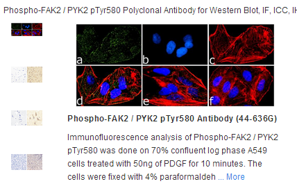 The antiserum was produced against a chemically synthesized phosphopeptide derived from the region of human Pyk2 that contains tyrosines 579 and 580. The sequence is conserved in mouse and rat.