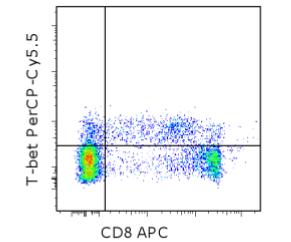 Description: The eBio4B10 monoclonal antibody reacts with mouse and human T-bet. T-bet is a Th1-specific T-box transcription factor critical to the development of the Th1 CD4+ T cell lineage. This is known based on the observations that T-Bet deficient mice have impaired Th1 cell development, and that ectopic expression of T-Bet results in development skewed to the Th1 lineage. T-Bet expression is induced by the Th1 cytokine IFN gamma, and T-Bet also regulates the expression of IFN gamma, likely, at least in part, through the modification of DNA accessibility and histone remodeling. In addition to IFN gamma, T-Bet is also known to regulate the expression of IL-12R beta and IL-2. Moreover, T-Bet plays a role in class-switch recombination in B-cells.