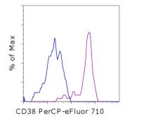 Description: The HB7 monoclonal antibody reacts with the human CD38 molecule, an approximately 45 kDa type II transmembrane protein. CD38 is an ectoenzyme which catalyses NAD into nicotinic acid adenine dinucleotide phosphate (NAADP) and cyclic ADP-ribose (cADPR), both of which are secondary messengers. Expression of CD38 is bimodal during B cell development, modulating from high in immature cells to low in intermediate ones and back to high on mature B cells. Additionally CD38 is found in a variety of tissues and other hematopoietic cells (e.g. T cells, NK cells and monocytes) and can be used to phenotype leukemias and monitor HIV-1 progression. The CD34+CD38- population of hematopoietic stems cells is thought to define the most pluripotent cells (e.g. blast colony forming cells). In addition to surface expression, CD38 has recently been found in the nucleus where it may play a role in monitoring calcium levels.