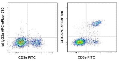 Description: The RM4-5 monoclonal antibody reacts with the mouse CD4 molecule, a 55 kDa cell surface receptor expressed by a majority of thymocytes, subpopulation of mature T cells and dendritic cells. CD4 binds to MHC class II on the surface of antigen presenting cells and plays an important role both in T cell development and in optimal functioning of mature T cells. In T cells, CD4 associates with protein tyrosine kinase p56lck through its cytoplasmic tail. Binding of RM4-5 is blocked by GK1.5.
