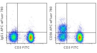 Description: This CMSSB monoclonal antibody reacts with human CD56, also known as Neural Cell Adhesion Molecule (NCAM). CD56 is a highly glycosylated transmembrane molecule expressed by neurons and plays a role in the homotypic adhesion of neural cells. In the hematopoietic system, CD56 is expressed on NK cells and a subset of T cells referred to as NKT cells. Staining with CMSSB does not block binding of MEM188 or CB56.