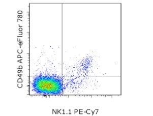 Description: The DX5 monoclonal antibody reacts with CD49b, an antigen expressed on a majority of mouse natural killer cells and a subset of T cells. DX5 reacts with all strains of mouse tested including the most commonly used strains, BALB/c, C57BL/6, C3H, CBA, DBA, AKR, SJL and 129. Simultaneous staining of C57BL/6 spleen cells with anti-NK1.1 mAb (PK136) and DX5 reveals coexpression of both markers by a majority of cells as well as presence of small populations of DX5+PK136- and DX5-PK136+ cells.