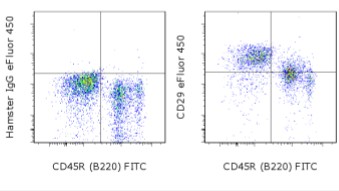 Description: The eBioHMb1-1 monoclonal antibody reacts with mouse and rat CD29 (integrin beta 1), a 110-120 kDa member of the beta integrin family expressed by leukocytes, endothelial, smooth muscle and epithelial cells. CD29 binds non-covalently with the alpha integrins CD49a-f to form the VLA-1 through VLA-6 complexes, as well as with CD51. These alpha-beta integrin heterodimers are capable of mediating a variety of cellular responses including adhesion, trafficking, proliferaton and differentiation. All integrins which include CD29 bind to extracellular matrix proteins including collagen, laminin, fibronectin and vitronectin, whereas some CD29-containing integrins can also interact with cellular receptors such as VCAM-1 and MadCAM-1.