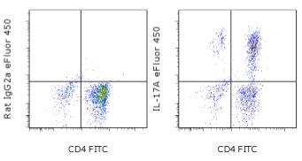 Description: The eBio17B7 antibody reacts with mouse and rat IL-17A with no recognition of IL-17F. Interleukin-17A (IL-17A) is a CD4+ T cell-derived cytokine that promotes inflammatory responses in cell lines and is elevated in rheumatoid arthritis, asthma, multiple sclerosis, psoriasis, and transplant rejection. The cDNA encoding human IL-17A was isolated from a library of CD4+ T cells; the encoded protein exhibits 72 percent amino acid identity with HVS13 , an open reading frame from a T lymphotropic Herpesvirus saimiri, and 63 percent with mouse CTLA-8 (cytotoxic T-lymphocyte associated antigen-8). Human IL-17A exists as glycosylated 20-30 kD homodimers. High levels of IL-17A homodimer are produced by activated peripheral blood CD4+ T-cells. IL-17A enhances expression of the intracellular adhesion molecule-1 (ICAM-1) in human fibroblasts. Human IL-17A also stimulates epithelial, endothelial, or fibroblastic cells to secrete IL-6, IL-8, G-CSF, and PGE2. In the presence of human IL-17A, fibroblasts can sustain the proliferation of CD34+ hematopoietic progenitors and induce maturation into neutrophils. Mouse, rat, and human IL-17A can induce IL-6 secretion in mouse stromal cells, indicating that all homologs can recognize the mouse IL-17A receptor.