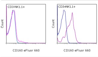 Description: CD160 is a glycosylphosphatidylinositol (GPI)-anchored Ig-like glycoprotein first identified on human lymphocytes with the monoclonal antibody BY55. In mice, CD160 is expressed on almost all (intestinal intraepithelial lymphocytes) iIELs, NKT cells, most TCRγδ T cells, few NK cells and a minor subset of CD8+ T cells. Murine CD160 has been shown to bind to a wide range of classical and non classical MHC class I molecules and regulate NK cell activation. In vitro, CD3 activation of murine CD8+ T cells increases the expression of CD160 and induces the release of soluble CD160 (sCD160). In human, CD160 mAb cross-linking triggers TNF alpha, IFN gamma and IL-6 cytokine production by peripheral blood NK cells and inhibits tube formation and induces apoptosis of endothelial cells. In mice, cross-linking of CD160 with the CNX46-3 antibody regulates NK cell activation both positively and negatively, depending on the stimulus.