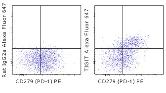 Description: The GIGD7 monoclonal antibody reacts with mouse T cell immunoreceptor with Ig and ITIM domains (TIGIT, VSTM3, WUCAM), a 26 kDa protein that is a member of the poliovirus receptor (PVR) family. In mice, the expression of TIGIT has been reported in follicular T helper cells, while in humans, the expression of TIGIT has been reported on NK cells, regulatory T cells, follicular T helper cells, memory CD4+ T cells, and CD8+ T cells. TIGIT is not expressed on B cells or naïve CD4+ T cells. TIGIT is upregulated on CD4+ T cells following activation. TIGIT can interact with certain members of the PVR and PVR-like families, including CD155, and also mediates the interaction of NK cells and T cells with antigen presenting cells, fibroblasts and endothelial cells that express PVR and PVR-like proteins.