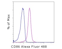 Description: The IT2.2 monoclonal antibody reacts with human CD86, an ~80 kDa surface receptor also known as B7-2. CD86 and CD80 are members of the B7 family of costimulatory molecules. CD86 is expressed at low levels on B cells, macrophages, and dendritic cells and is upregulated on B cells through a variety of surface stimuli including the BCR complex, CD40 and some cytokine receptors. In addition to CD80 (B7-1), CD86 is a counter-receptor for the T cell surface molecules CD28 and CD152 (CTLA-4). The interaction of CD86 with its ligands plays a critical role in T-B crosstalk, T cell costimulation, autoantibody production and Th2-mediated Ig production. The kinetics of upregulation of CD86 upon stimulation supports its major contribution during the primary phase of an immune response.