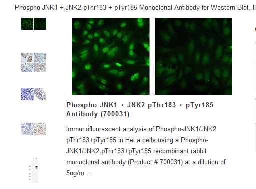 C-Jun N-terminal Kinase (JNK) is also known as Mitogen-activated protein kinase (MAPK8). It belongs to the MAPK superfamily of stress-activated protein kinases. MAPKs are Serine-threonine protein kinases that are activated in response to a variety of extracellular stimuli, and mediate signal transduction from the cell surface to the nucleus. JNK is involved in a wide variety of cellular processes such as proliferation, differentiation, transcription regulation and development. JNK pathways are activated by stress and inflammatory signals. JNK is expressed as ten different isoforms due to differential mRNA splicing. The predominant forms are JNK1 and JNK2.