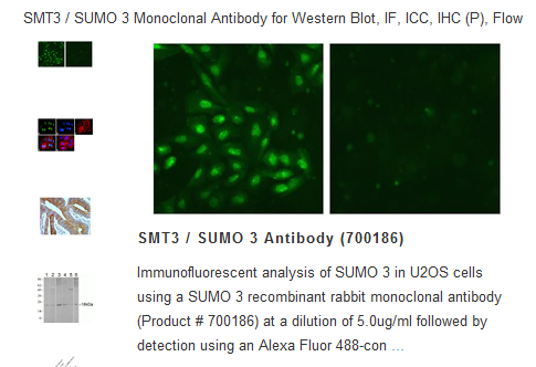 Small ubiquitin-related modifier proteins are members of the ubiquitin-like protein family. SUMO-3 regulates Amyloid beta generation and may be critical in the onset or progression of Alzheimer's disease. SUMO-2/3 forms poly-. SUMO-1, 2, and 3 proteins localize to the nuclear membrane, nuclear bodies, and cytoplasm, respectively. SUMOylation is essential for mammalian cell cycle regulation, SUMO-2/3 localizes to centromeres and condensed chromosomes where binds CENP-E.